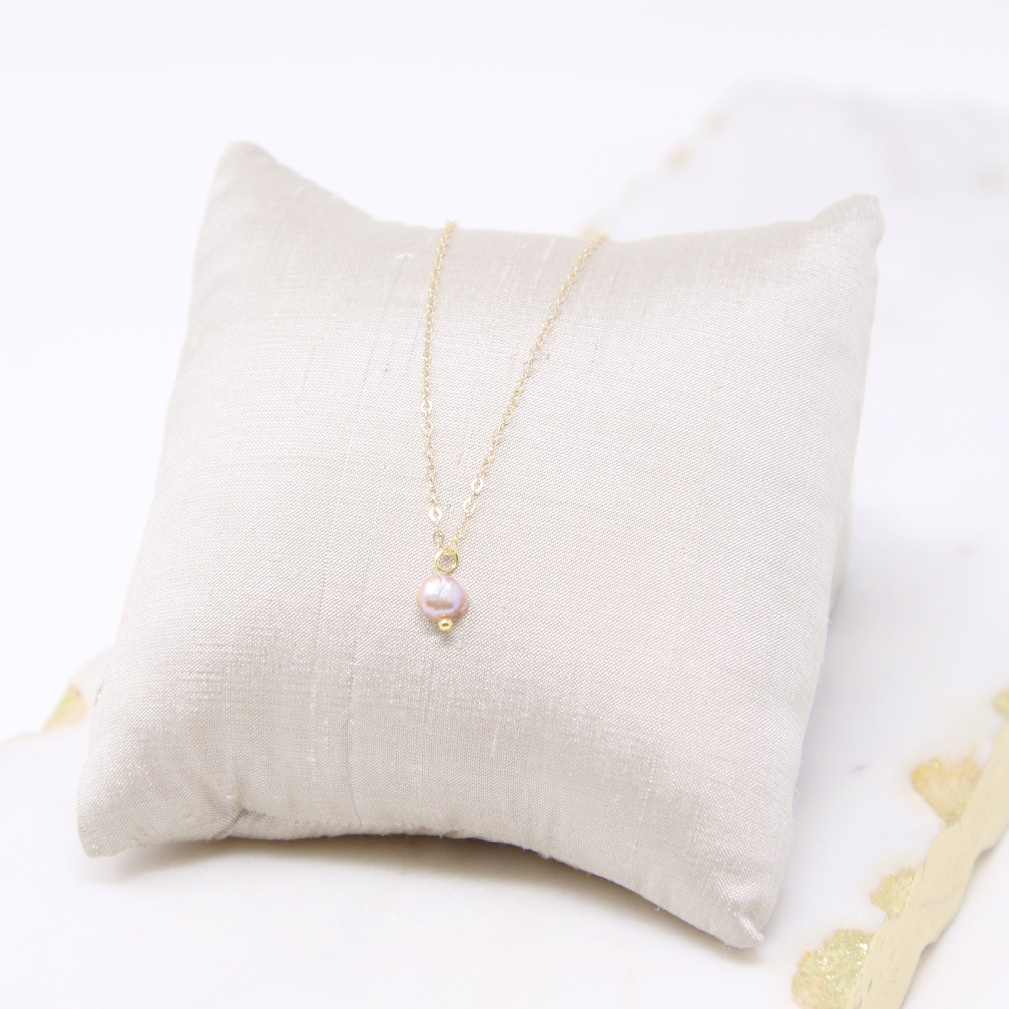 Delicate and effortlessly elegant. This necklace features a soft blush freshwater pearl on a dainty 15-inch gold-filled chain. A timeless piece that adds just the right touch of feminine charm to your everyday look.